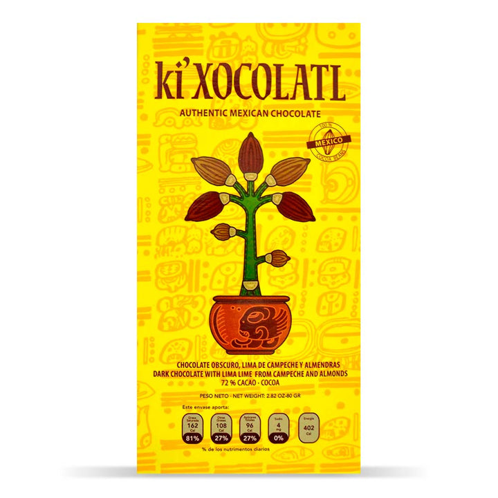 Barra Gourmet de Chocolate Oscuro 72% con Lima de Campeche y Almendra. Elaborada con 100% Cacao Criollo Mexicano. Un detalle fascinante para los fans del chocolate auténtico.