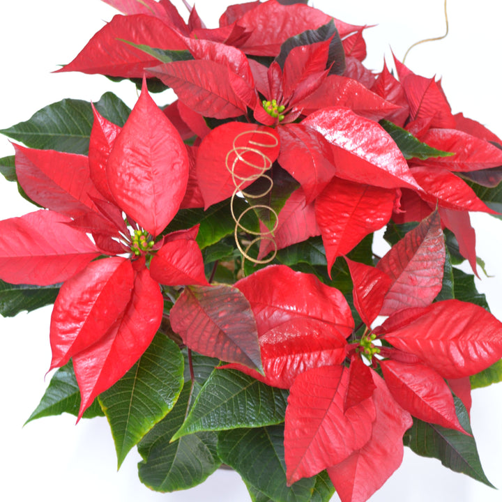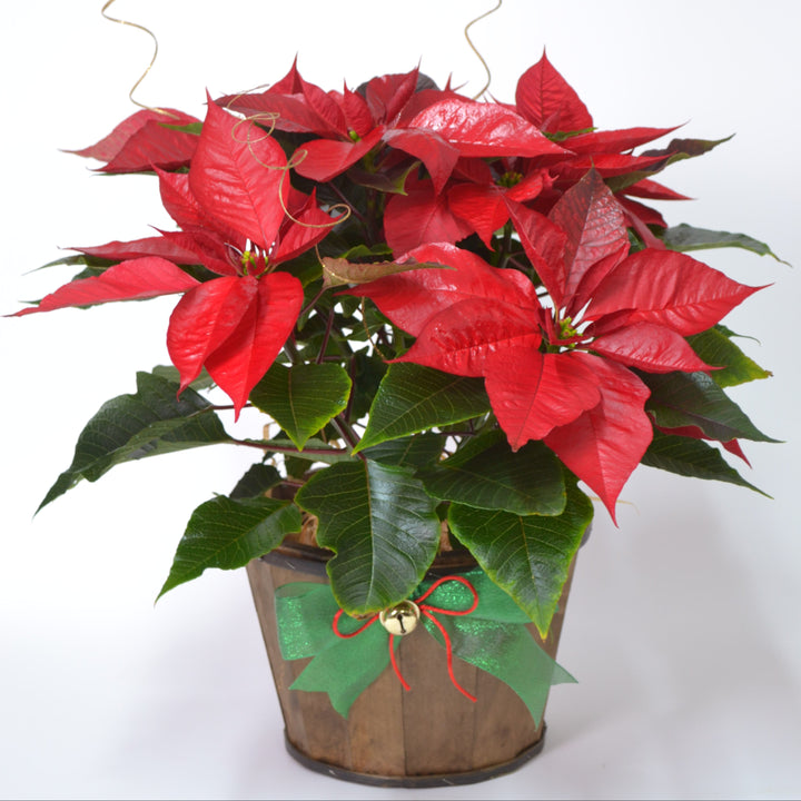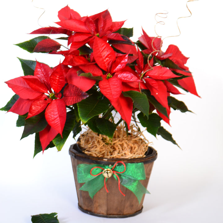Una hermosa planta de Nochebuena presentada en una base rústica de madera, cuidadosamente decorada con detalles navideños que evocan calidez y elegancia. Su vibrante color rojo ilumina cualquier espacio, llenándolo del espíritu de la temporada. 🌟